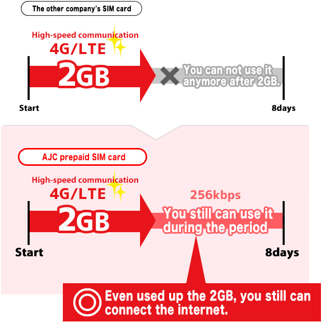 Global Connection, Inc. Original "AJC (All Japan Communications) All Japan Prepaid SIM Card" is a SIM card dedicated to data communication that can be used in Japan. Contracts, cancellation, return of cards etc. are unnecessary, so it is a very popular item with tourists visiting Japan recently. Of course, even those living in Japan can use it for domestic travels or business trips. High speed communication 4G / LTE line is compatible so you can use it anywhere in Japan.