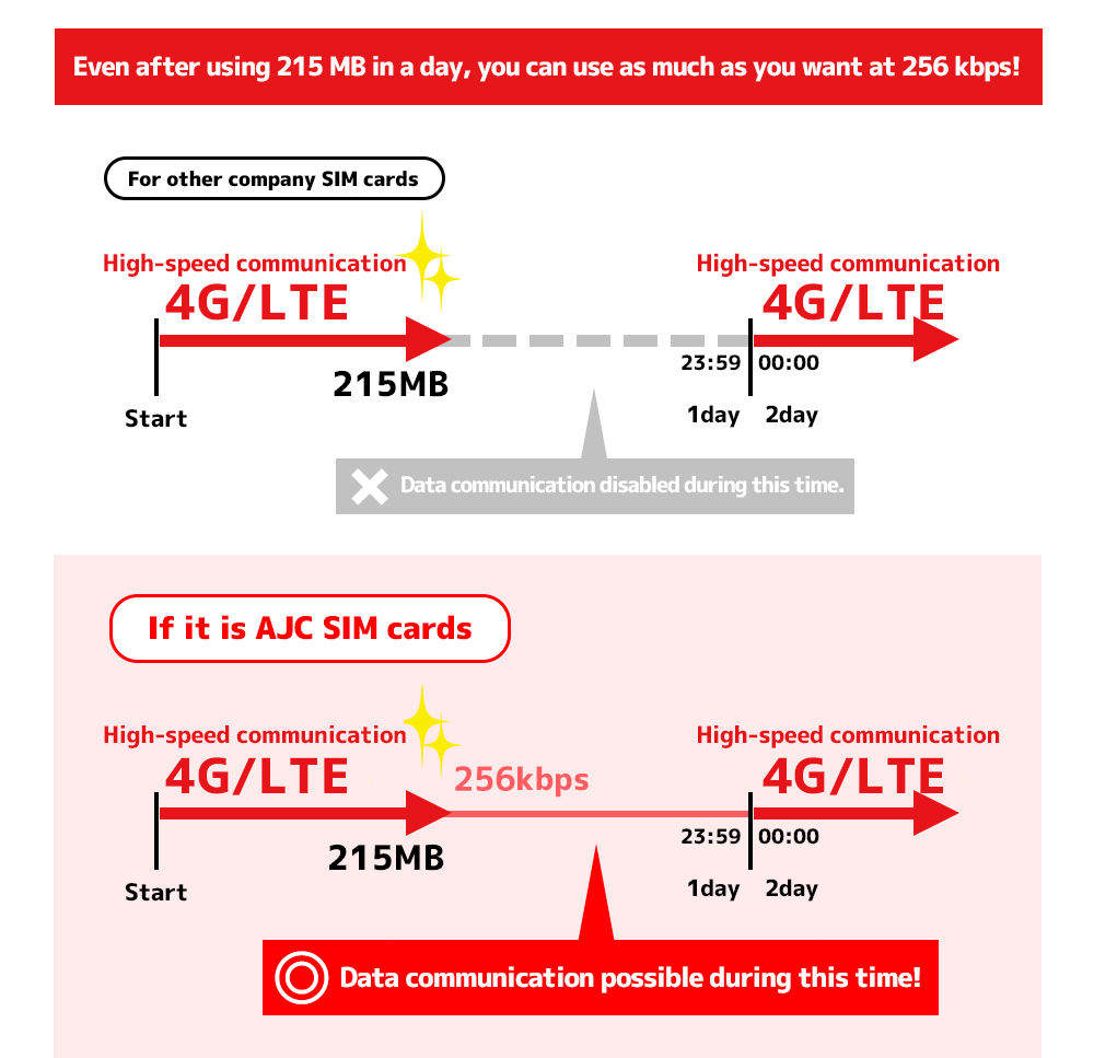 Global Connection, Inc. Original "AJC (All Japan Communications) All Japan Prepaid SIM Card" is a SIM card dedicated to data communication that can be used in Japan. Contracts, cancellation, return of cards etc. are unnecessary, so it is a very popular item with tourists visiting Japan recently. Of course, even those living in Japan can use it for domestic travels or business trips. High speed communication 4G / LTE line is compatible so you can use it anywhere in Japan.