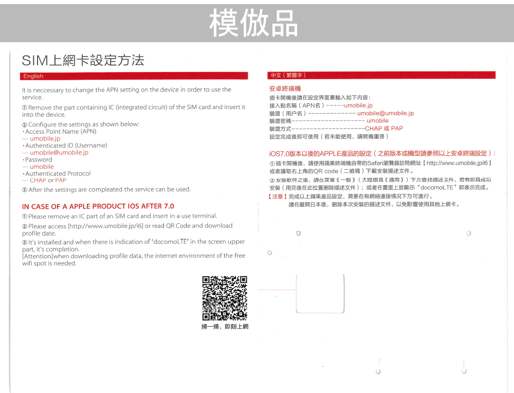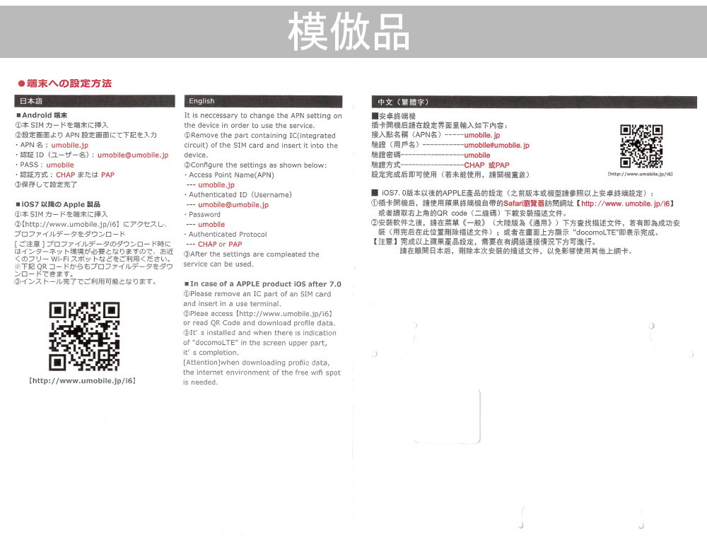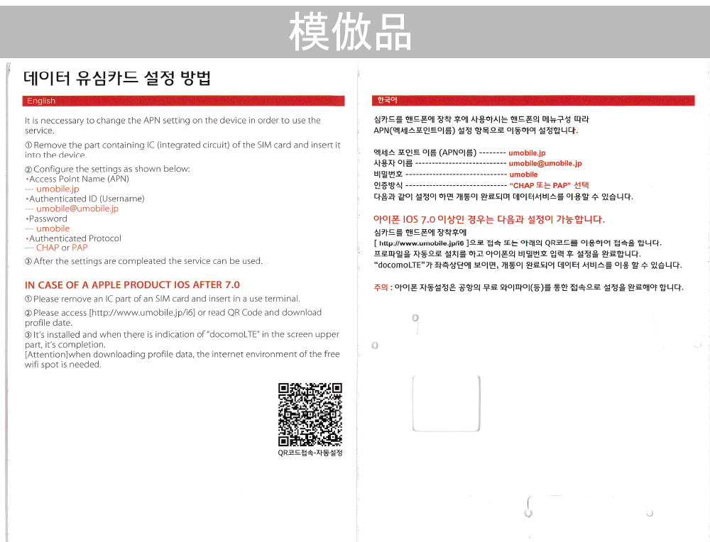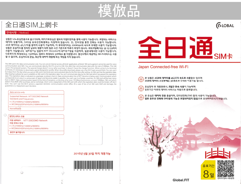 最近、弊社ブランド「全日通プリペイドSIMカード」にパッケージが酷似した商品が日本国外において販売されていることが判明いたしました。これら類似商品・模倣品は形状、表示において大変似通っておりますが、弊社商品とはサービス内容において大きく異なります。